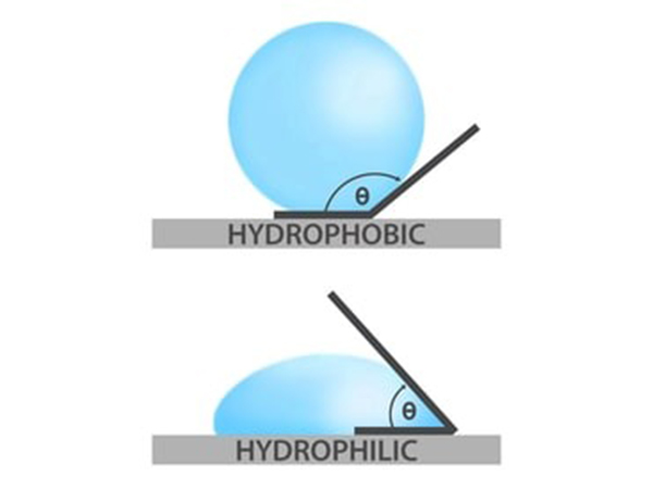 물 분자와 물질 사이의 정전기적 인력이 물 분자 자체 사이의 인력보다 크면 물방울이 퍼집니다. 여기서 물방울 가장자리와 표면 사이의 순간 각도, 즉 물 접촉각은 <90°입니다. 이러한 물질을 친수성 이라고 하며 문자 그대로 "물을 좋아함"을 의미합니다. 재료 표면의 친수성이 높을수록 물 접촉각은 낮아집니다.