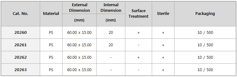[20260] 20260/Material:PS,External Dimension(mm):60.00 x 15.00,Internal Dimension(mm):20,Surface Treatment:+,Sterile:+ + 286,000원