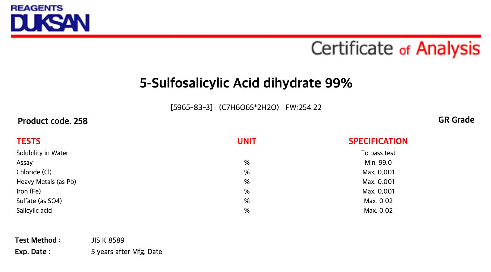 [258] 5-Sulfosalicylic Acid dihydrate, GR, 25g, CAS# 5965-83-3 + 14,300원