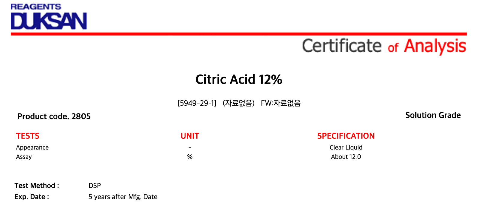 [2805] Citric Acid 12%, Solution, 1 ℓ, CAS# 5949-29-1 + 9,700원