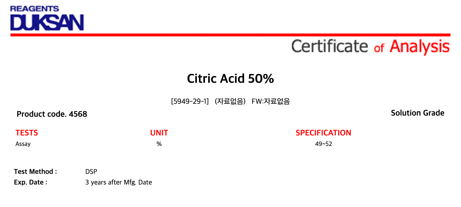 [4568] Citric Acid 50%, Solution, 20 kg, CAS# 5949-29-1 + 130,600원
