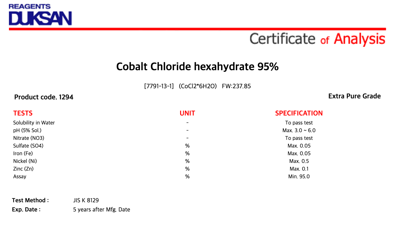 Cobalt (II) chloride hexahydrate ; cobalt chloride hydrate ; cobalt(2+) dichloride hexahydrate ; Cobalt dichloride hexahydrate