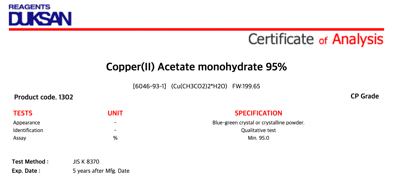 [1302] Copper(II) Acetate monohydrate, CP, 25 g, CAS# 6046-93-1 + 4,900원