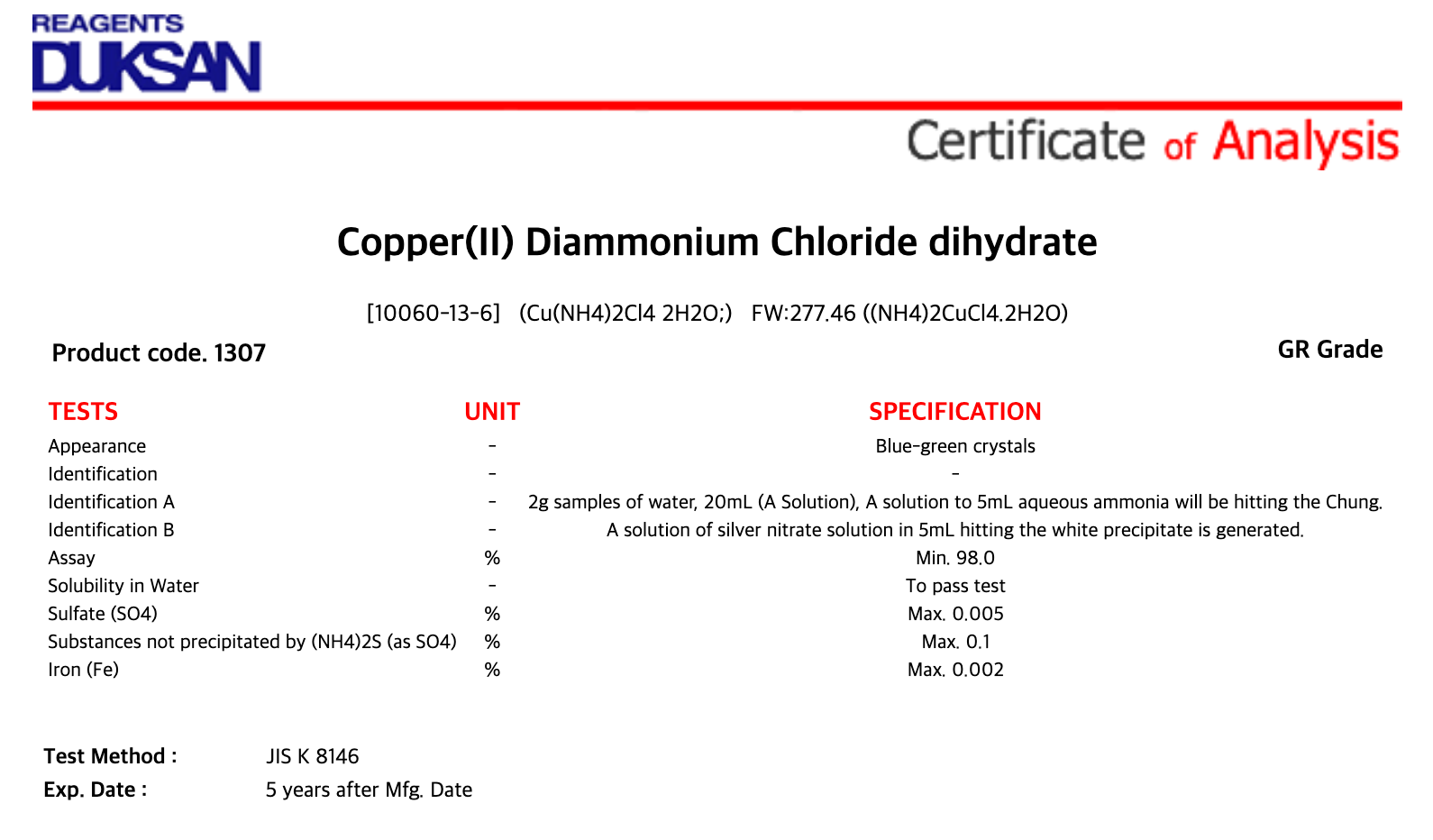 [1307] Copper(II) Diammonium Chloride dihydrate, GR, 25 g, CAS# 10060-13-6 + 8,000원