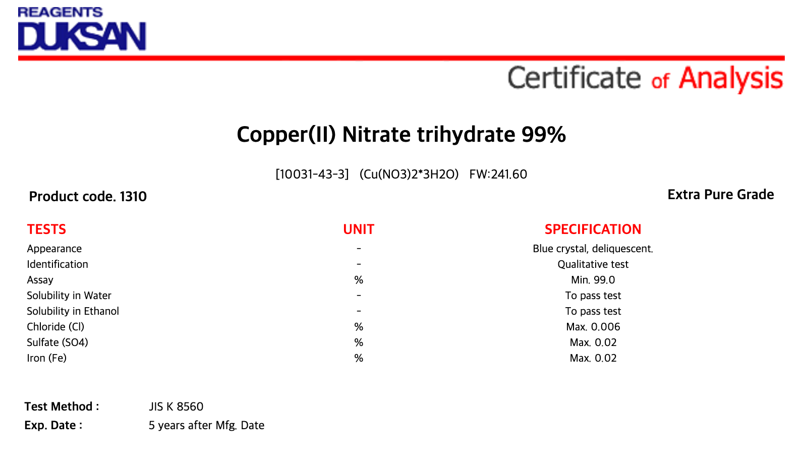 [1310] Copper(II) Nitrate trihydrate, Extra Pure, 500 g, CAS# 10031-43-3 + 19,500원