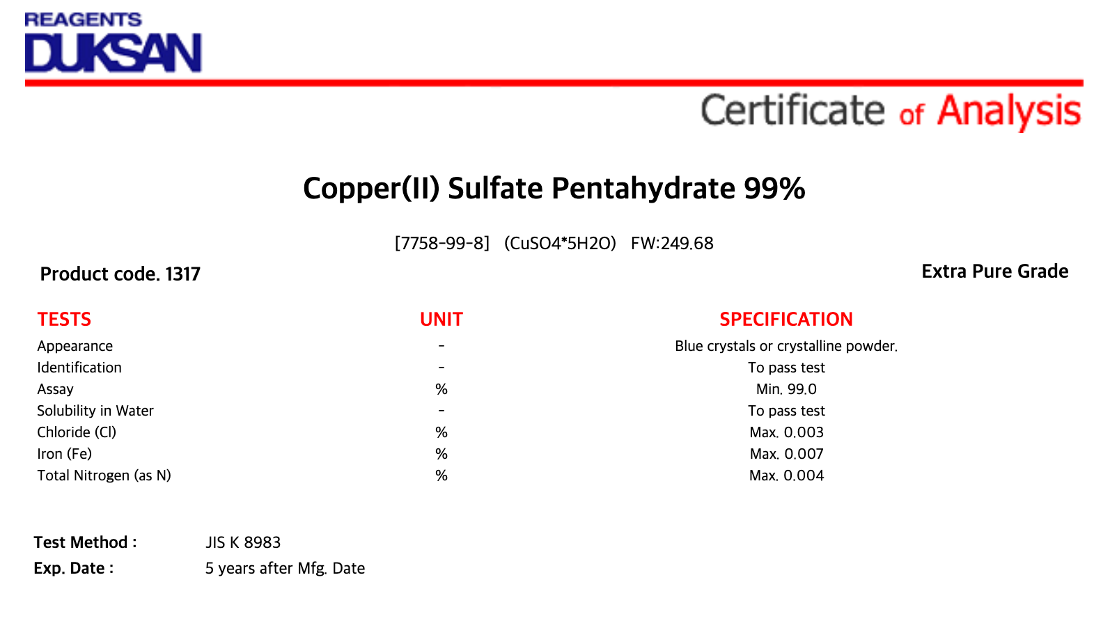 [1317] Copper(II) Sulfate Pentahydrate, Extra Pure, 20 kg, CAS# 7758-99-8 + 272,200원