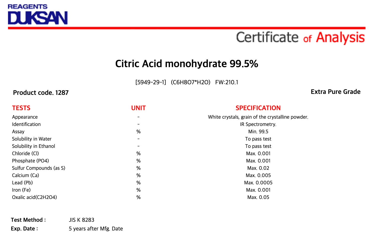 1287 1. itric Acid monohydrate, Extra Pure, 500 g, CAS# 5949-29-1 1/EA 소비자가 : 8,800원