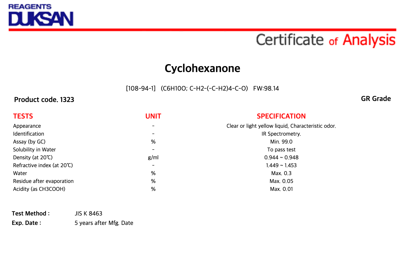 1323 1. Cyclohexanone, GR, 500 ㎖, CAS# 108-94-1 1/EA 소비자가 : 10,200원