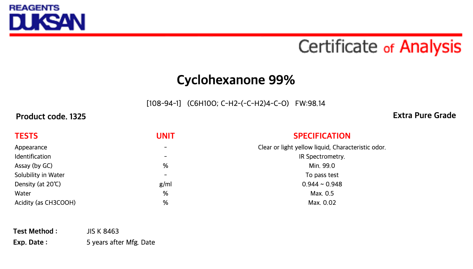 1325 1. Cyclohexanone, Extra Pure, 1 ℓ, CAS# 108-94-1 1/EA 소비자가 : 13,800원
