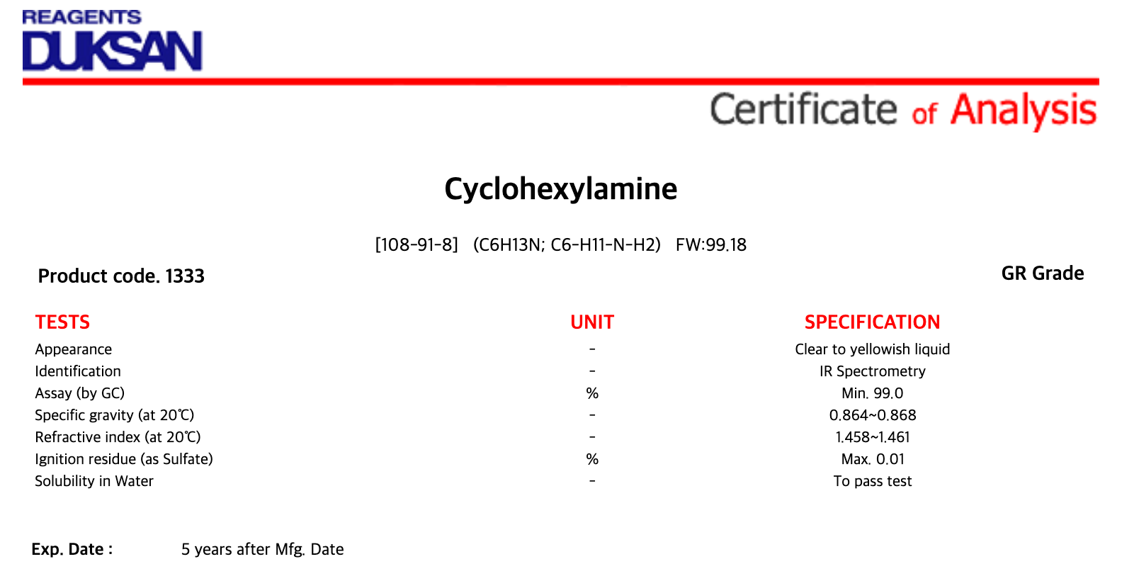[1333] Cyclohexylamine, GR, 500 g, CAS# 108-91-8 + 14,300원
