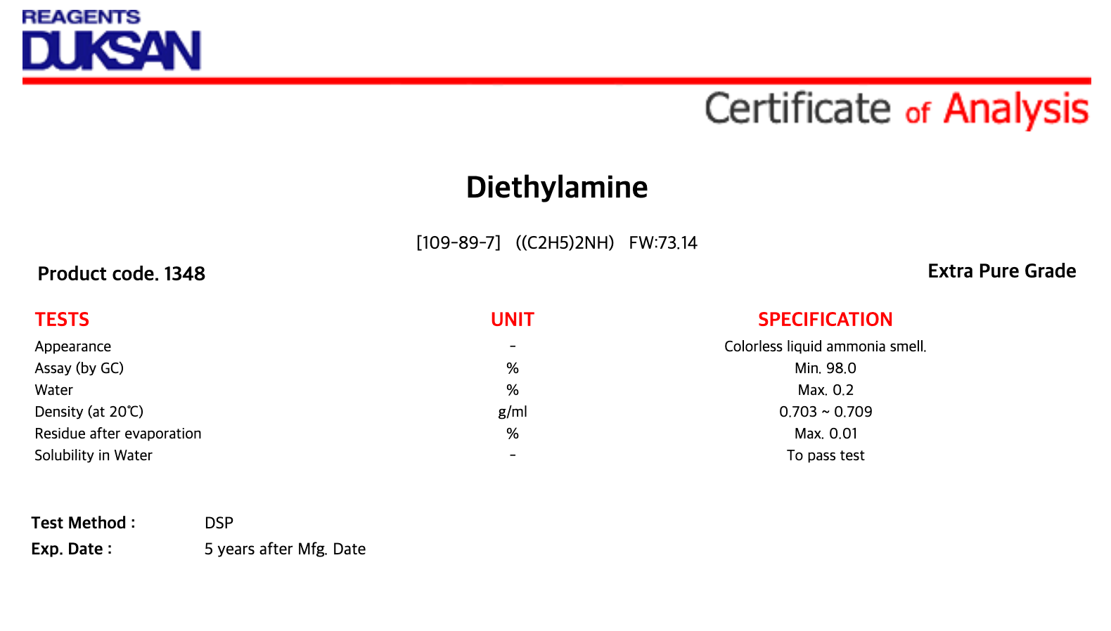 1348 1. Diethylamine, Extra Pure, 1 ℓ, CAS# 109-89-7 1/EA 소비자가 : 13,800원