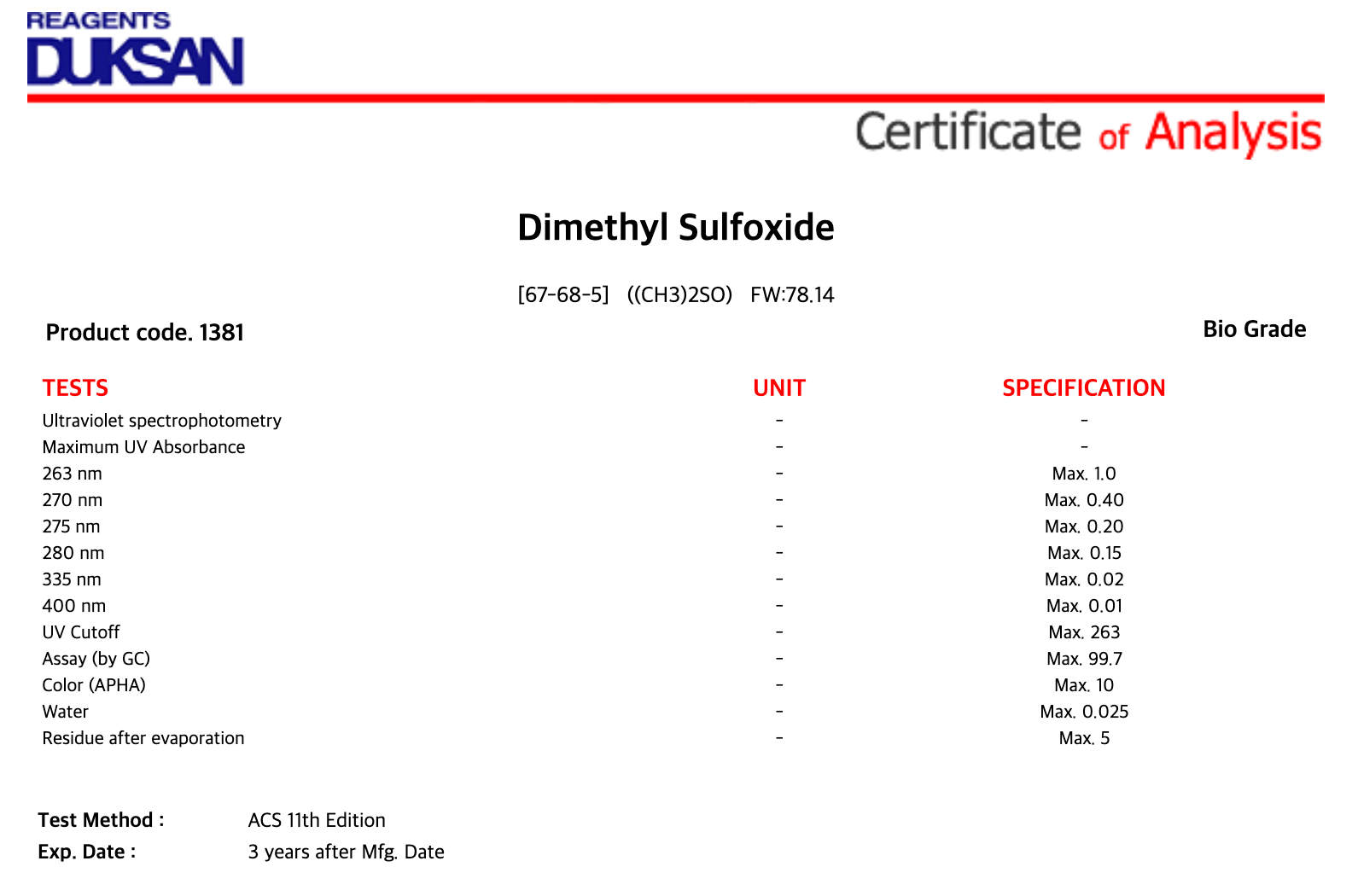 [1381] Dimethyl Sulfoxide, Bio, 4 ℓ, CAS# 67-68-5 + 130,600원