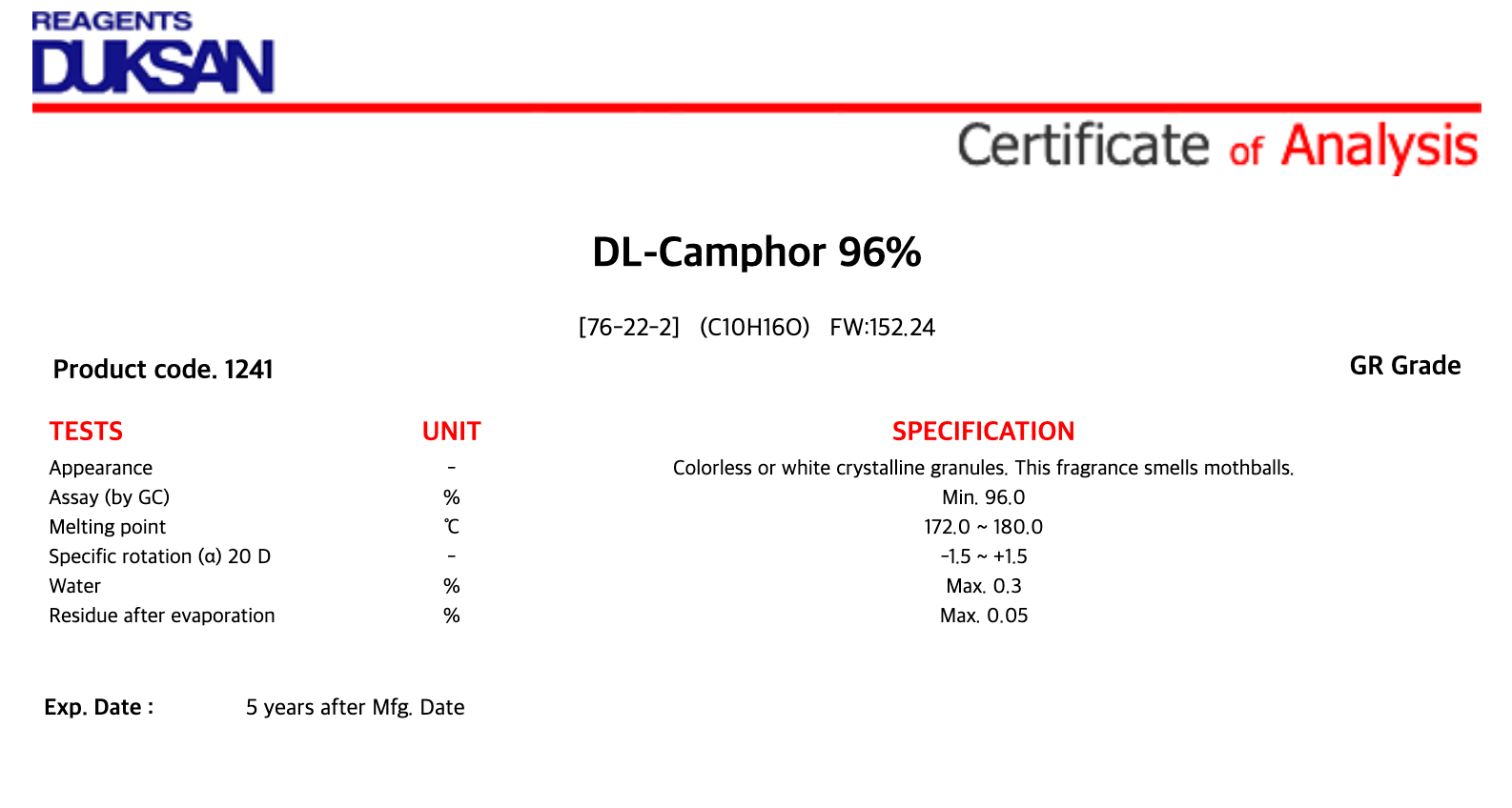 [1241] DL-Camphor, GR, 500 g, CAS# 21368-68-3 + 37,100원
