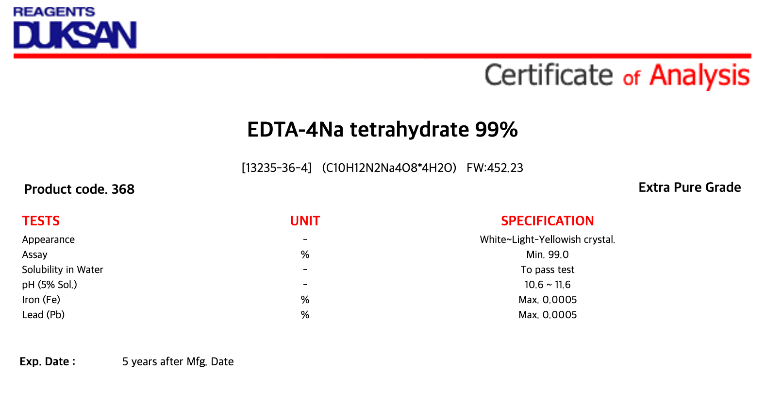 | 품명 : | EDTA-4Na tetrahydrate 99% |