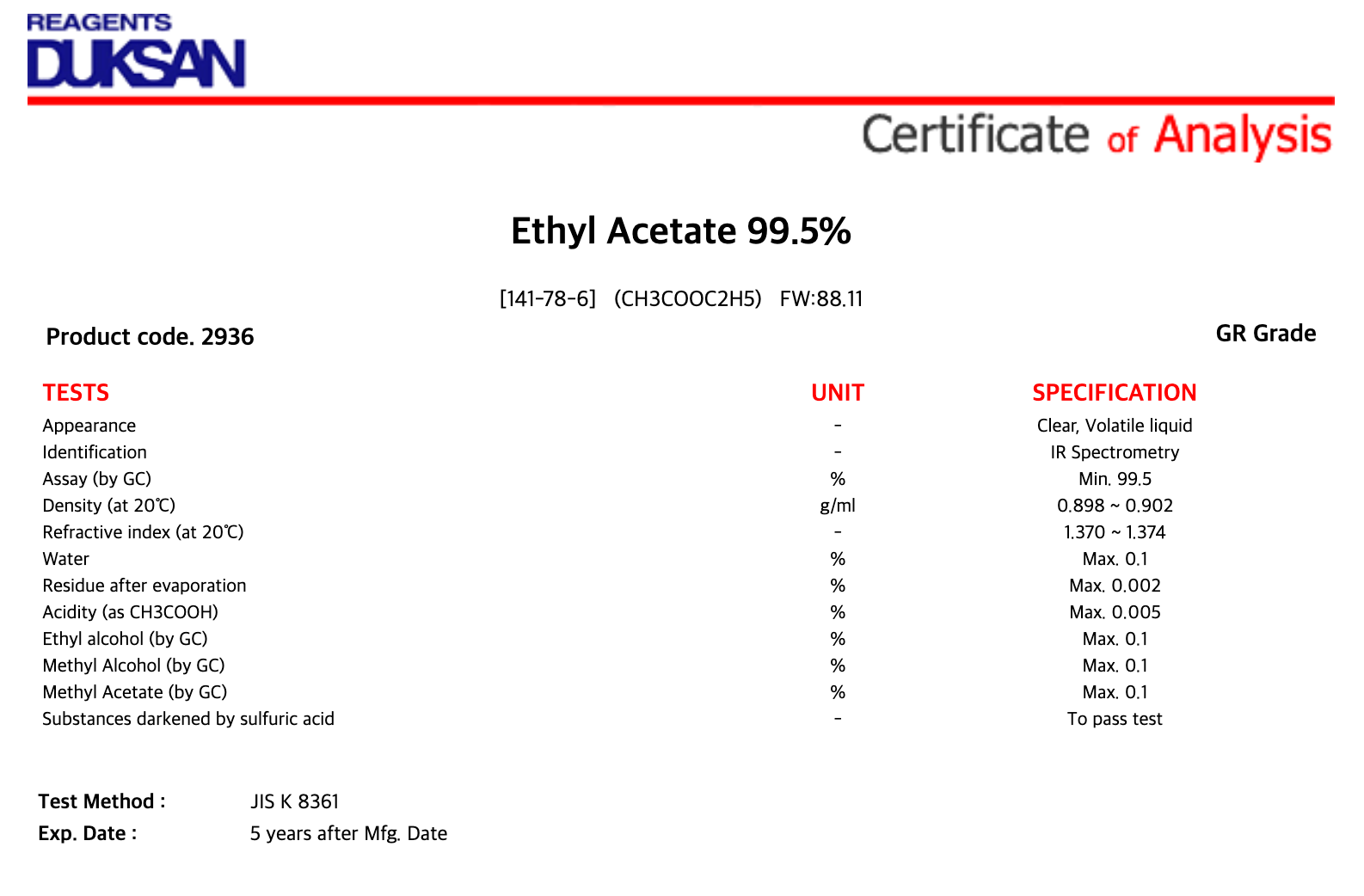 2936 1. Ethyl Acetate, GR, 4 ℓ, CAS# 141-78-6 1/EA 소비자가 : 27,200원
