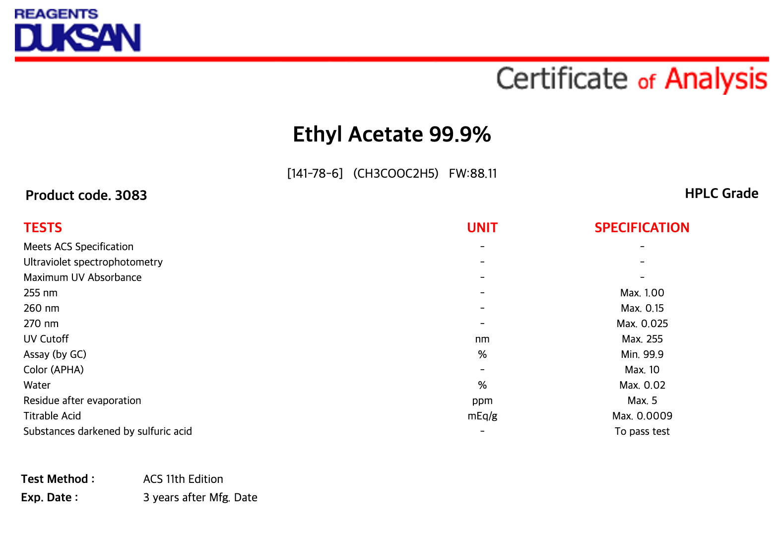 3083 1. Ethyl Acetate, HPLC, 4 ℓ, CAS# 141-78-6 1/EA 소비자가 : 52,200원