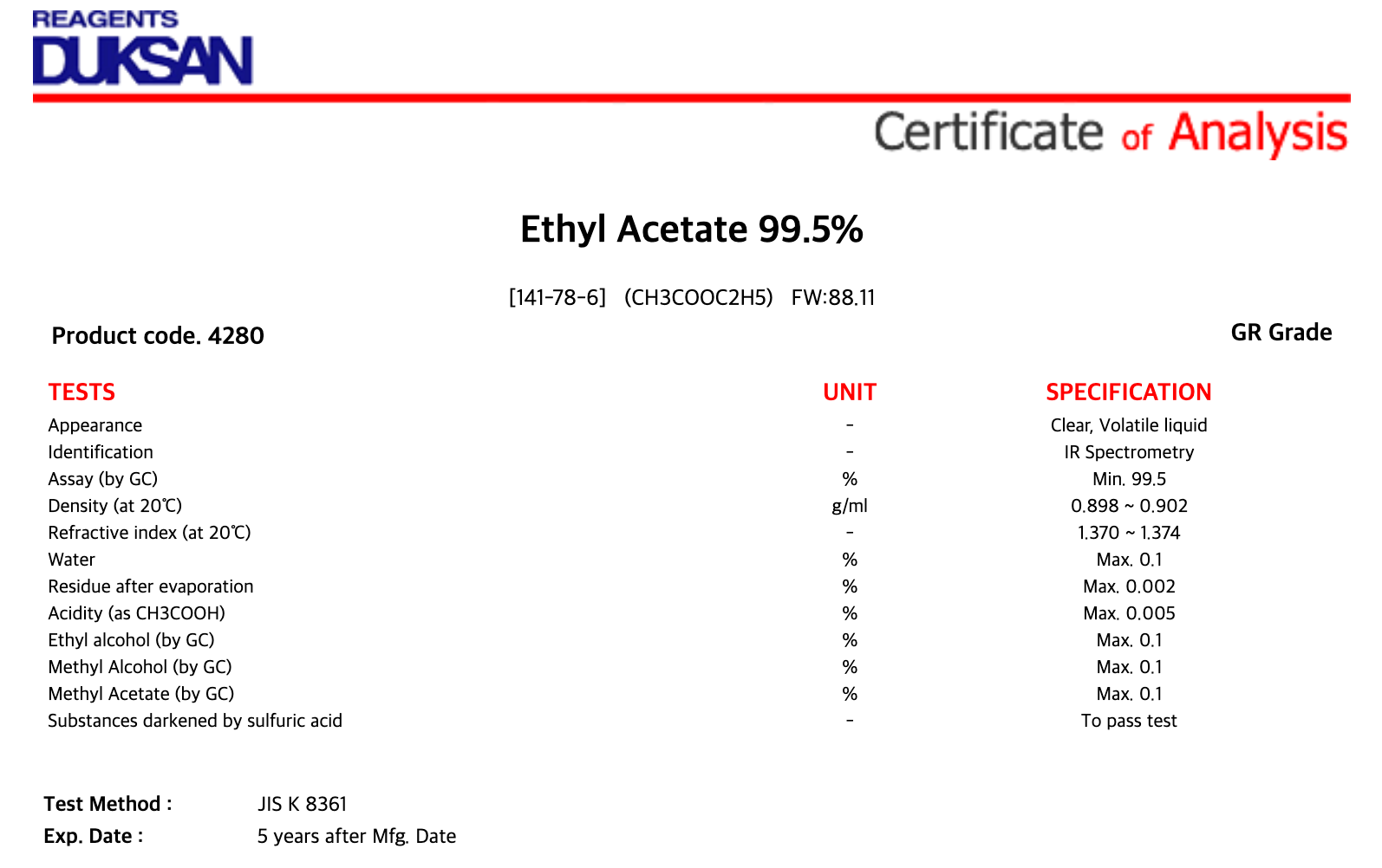 4280 1. Ethyl Acetate, GR, 2.5 ℓ, CAS# 141-78-6 1/EA 소비자가 : 21,800원