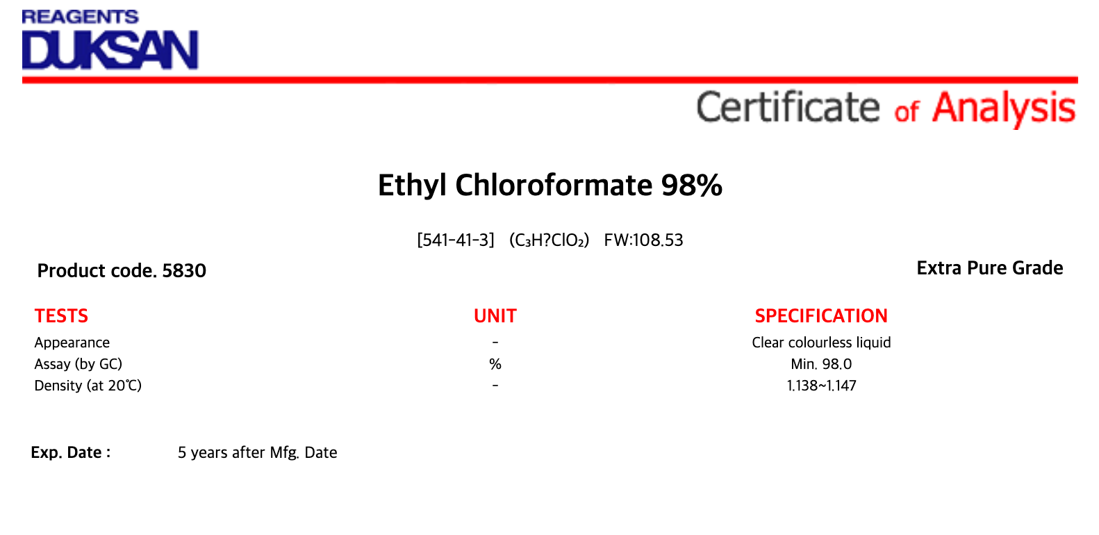 [5830] Ethyl Chloroformate, Extra Pure, 1 ℓ, CAS# 541-41-3 + 45,400원