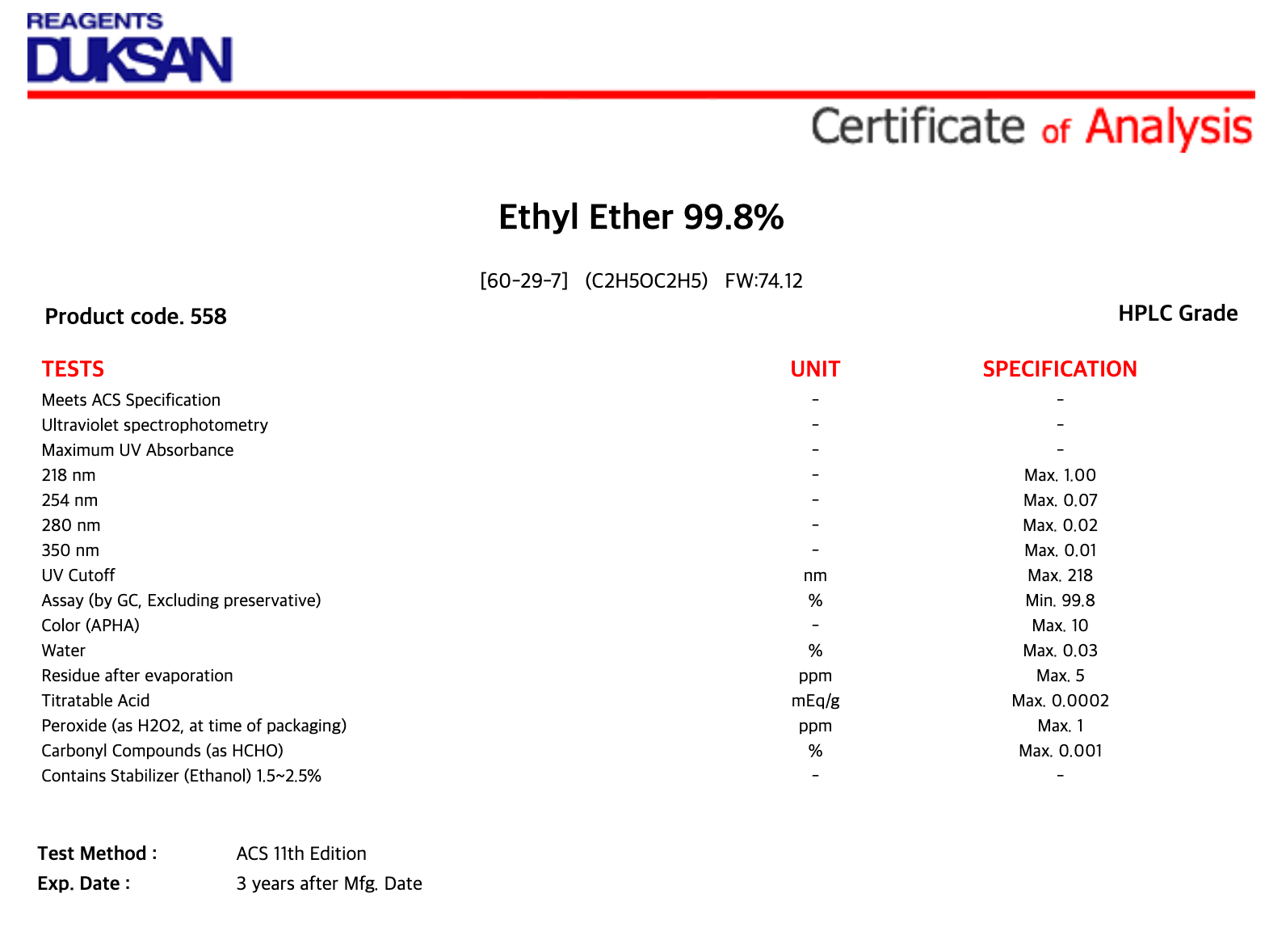 | 품명 : | Ethyl Ether 99.8% |