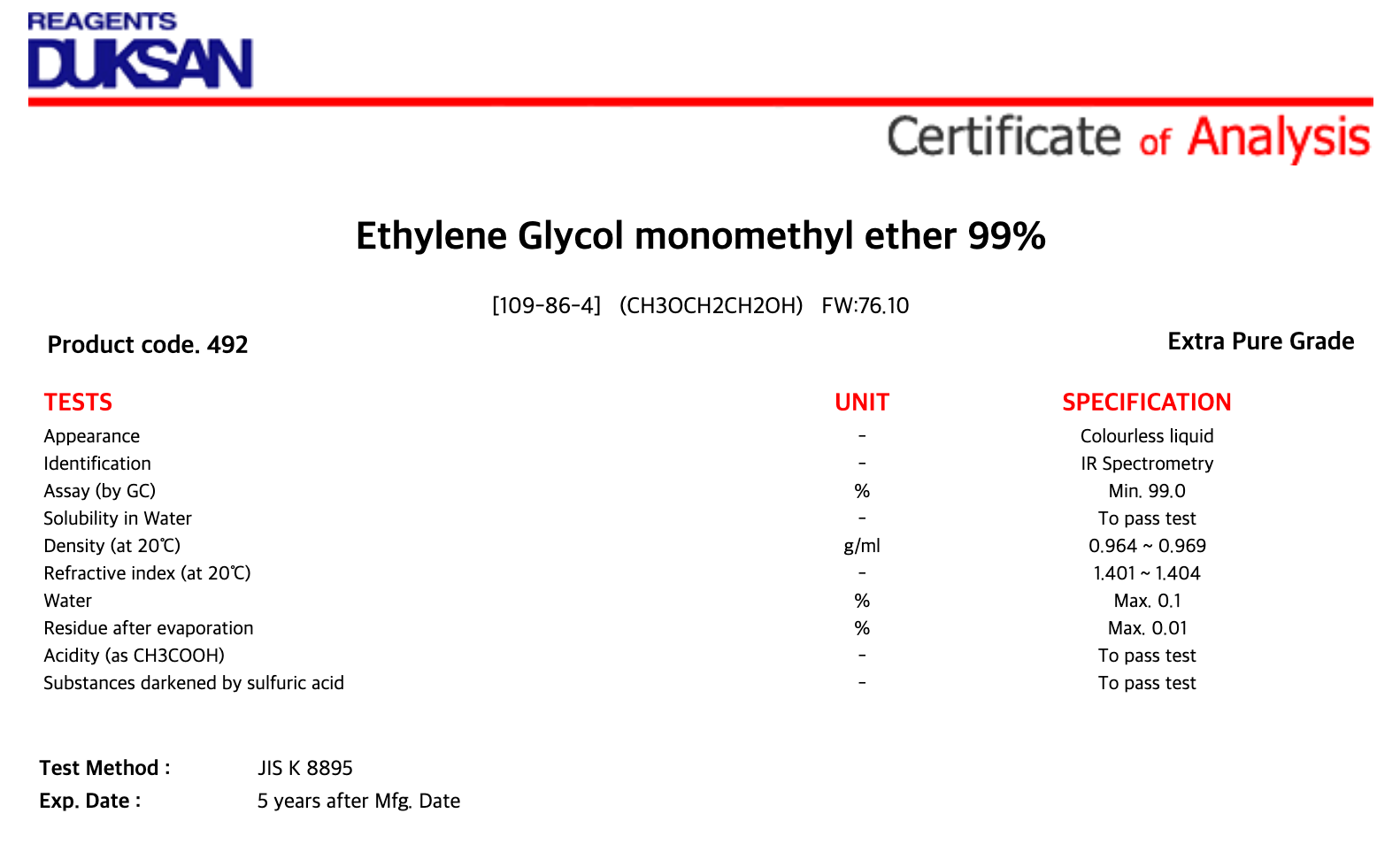 492 1. Ethylene Glycol monomethyl ether, Extra Pure, 1 ℓ, CAS# 109-86-4 1/EA 소비자가 : 13,800원
