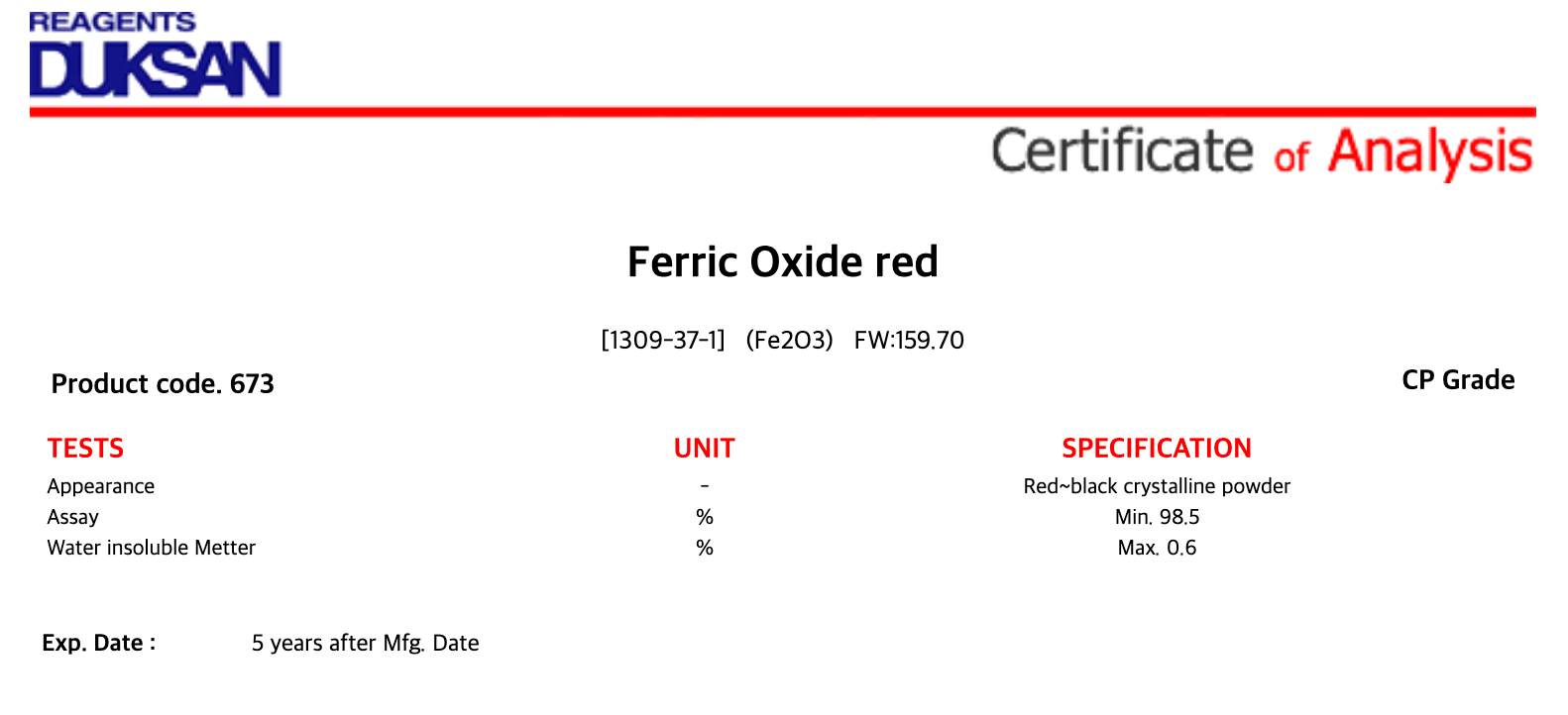 1. Ferric Oxide red, CP, 500 g, CAS# 1309-37-1