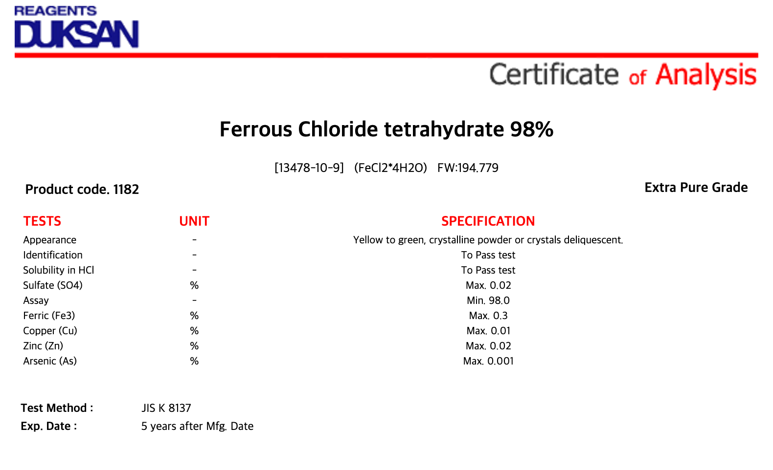 [1182] Ferrous Chloride tetrahydrate, Extra Pure, 500 g, CAS# 13478-10-9 + 15,800원