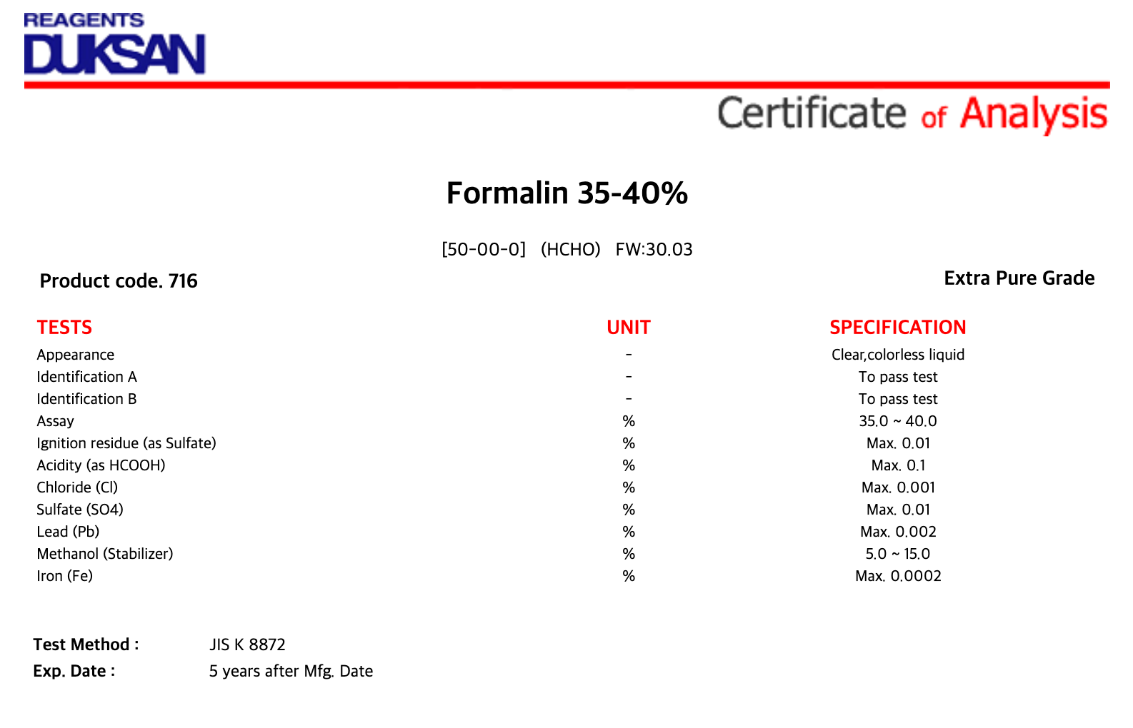 [716] Formalin, Extra Pure, 500 g, CAS# 50-00-0 + 6,600원