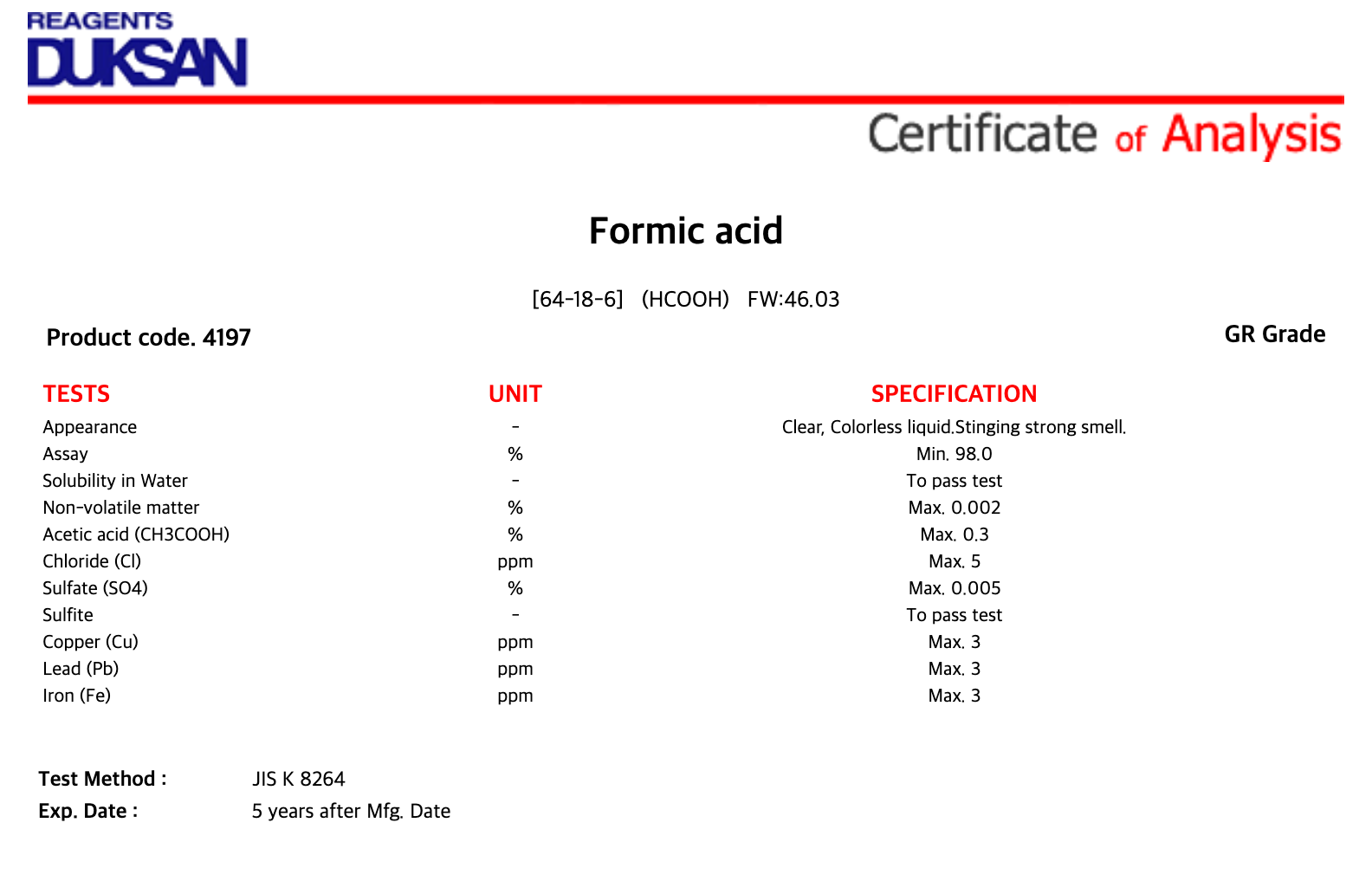 4197 1. Formic acid, GR, 2.5 ℓ, CAS# 64-18-6 1/EA 소비자가 : 30,600원