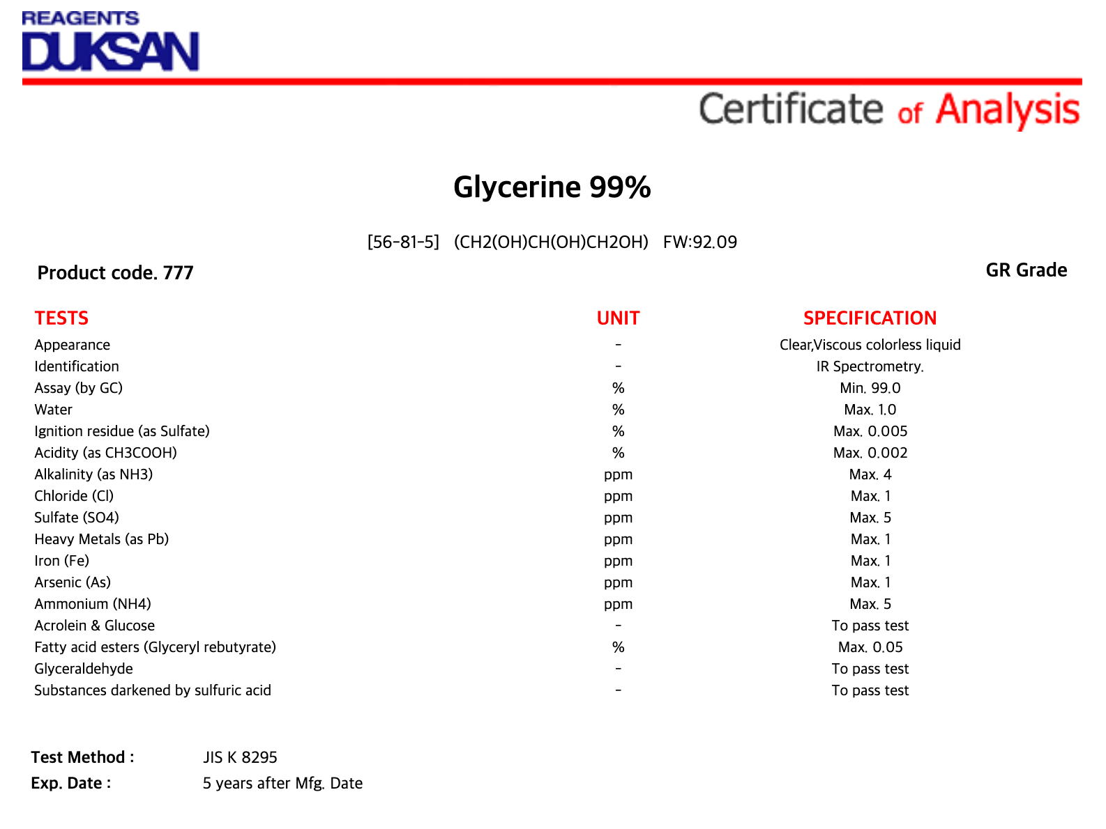 | 품명 : | Glycerine 99% |