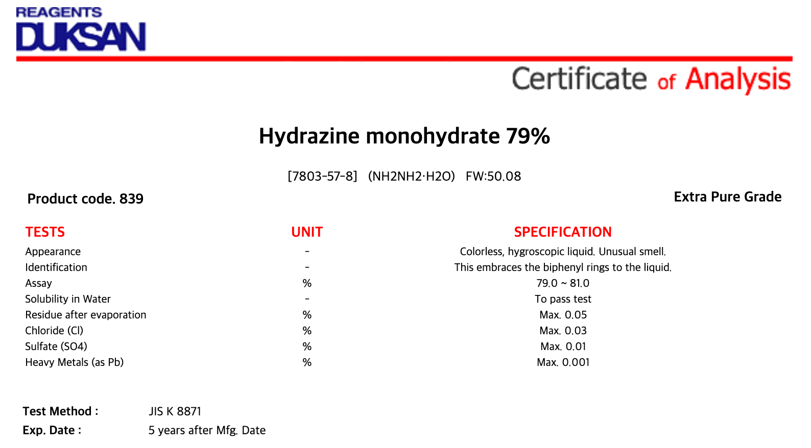 [839] Hydrazine monohydrate, Extra Pure, 1 kg, CAS# 7803-57-8 + 41,200원