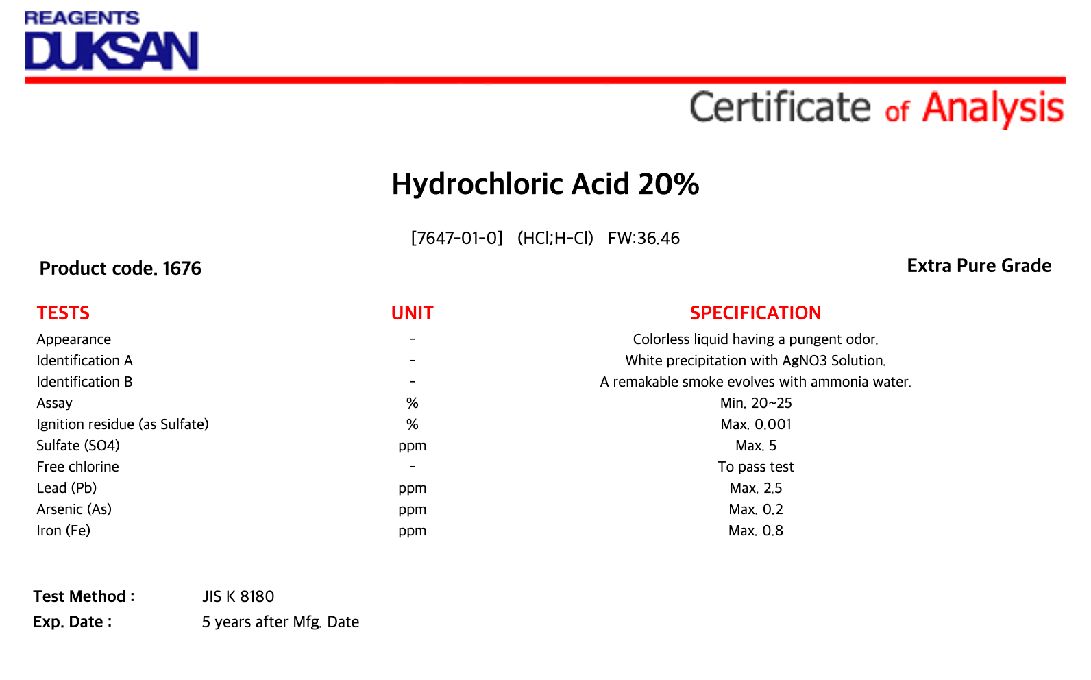[1676] Hydrochloric Acid 20%, Extra Pure, 20 kg, CAS# 7647-01-0 + 26,100원