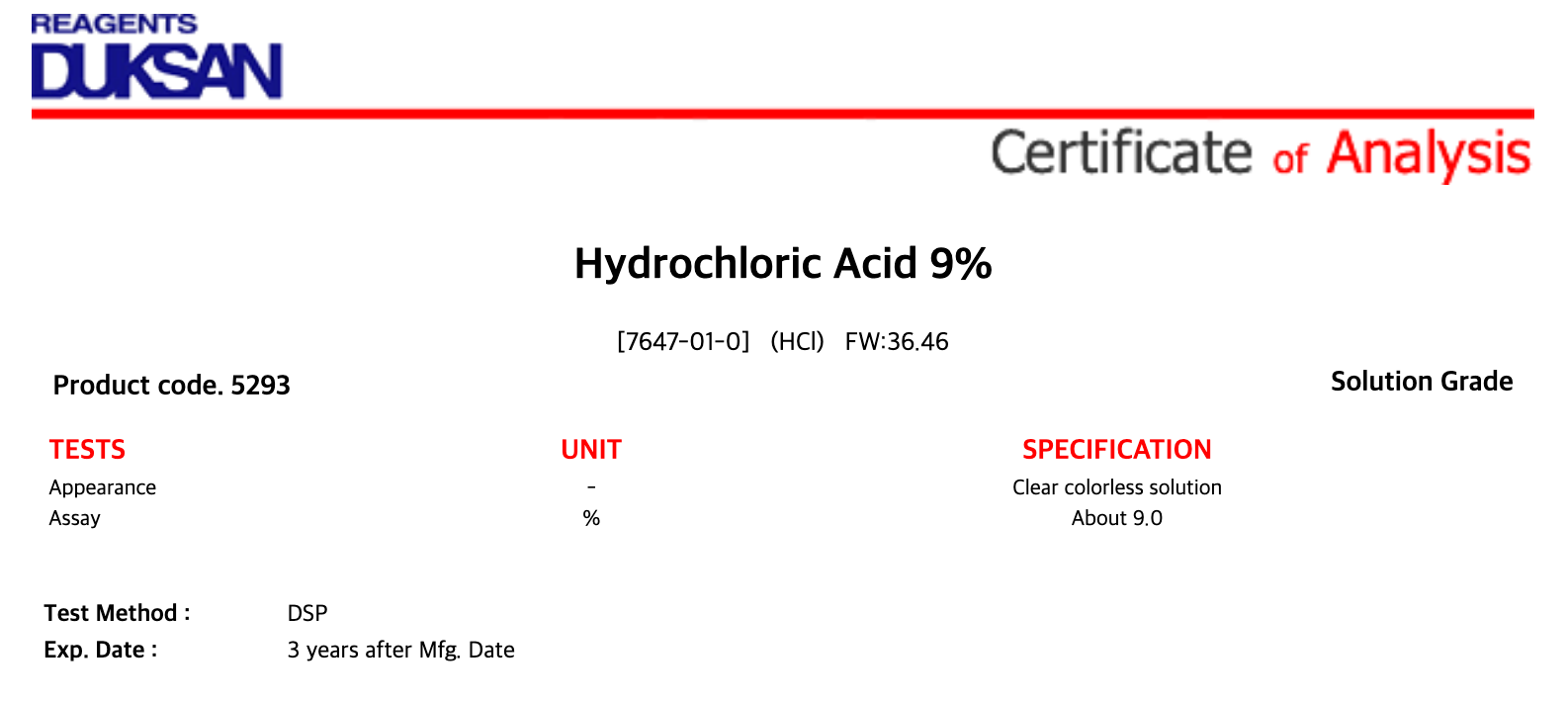 [5293] Hydrochloric Acid 9%, Solution, 20 kg, CAS# 7647-01-0 + 30,300원