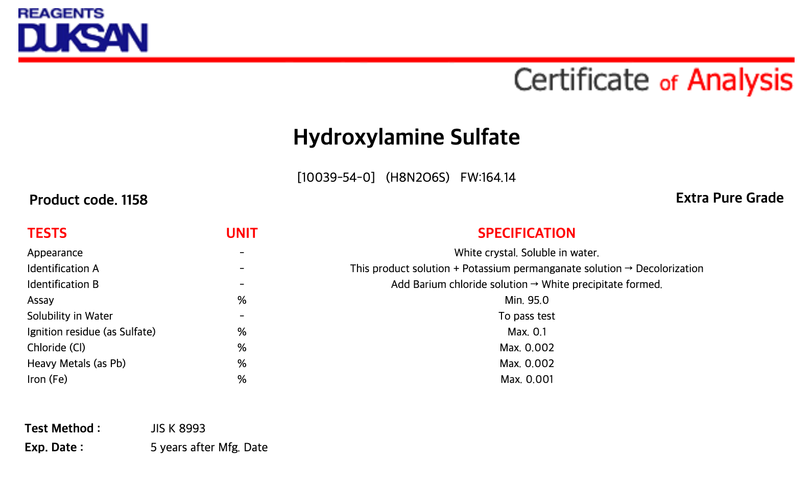 Bis(hydroxylammonium) sulfate: bis(hydroxylammonium)sulphate; Hydroxyammonium sulphate; Hydroxyl ammonium sulfate황산하이드록실아민 : 다이(하이드록실아민) 황산염; 비스(하이드록실암모늄) 설페이트