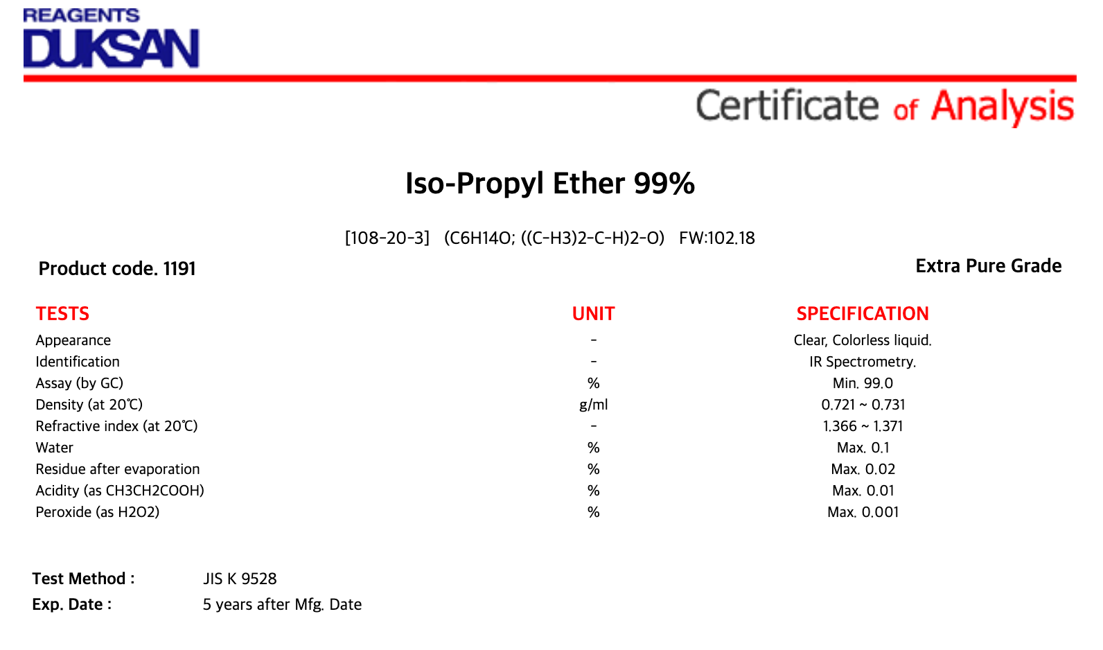 [1191] Iso-Propyl Ether, Extra Pure, 500 ㎖, CAS# 108-20-3 + 11,100원