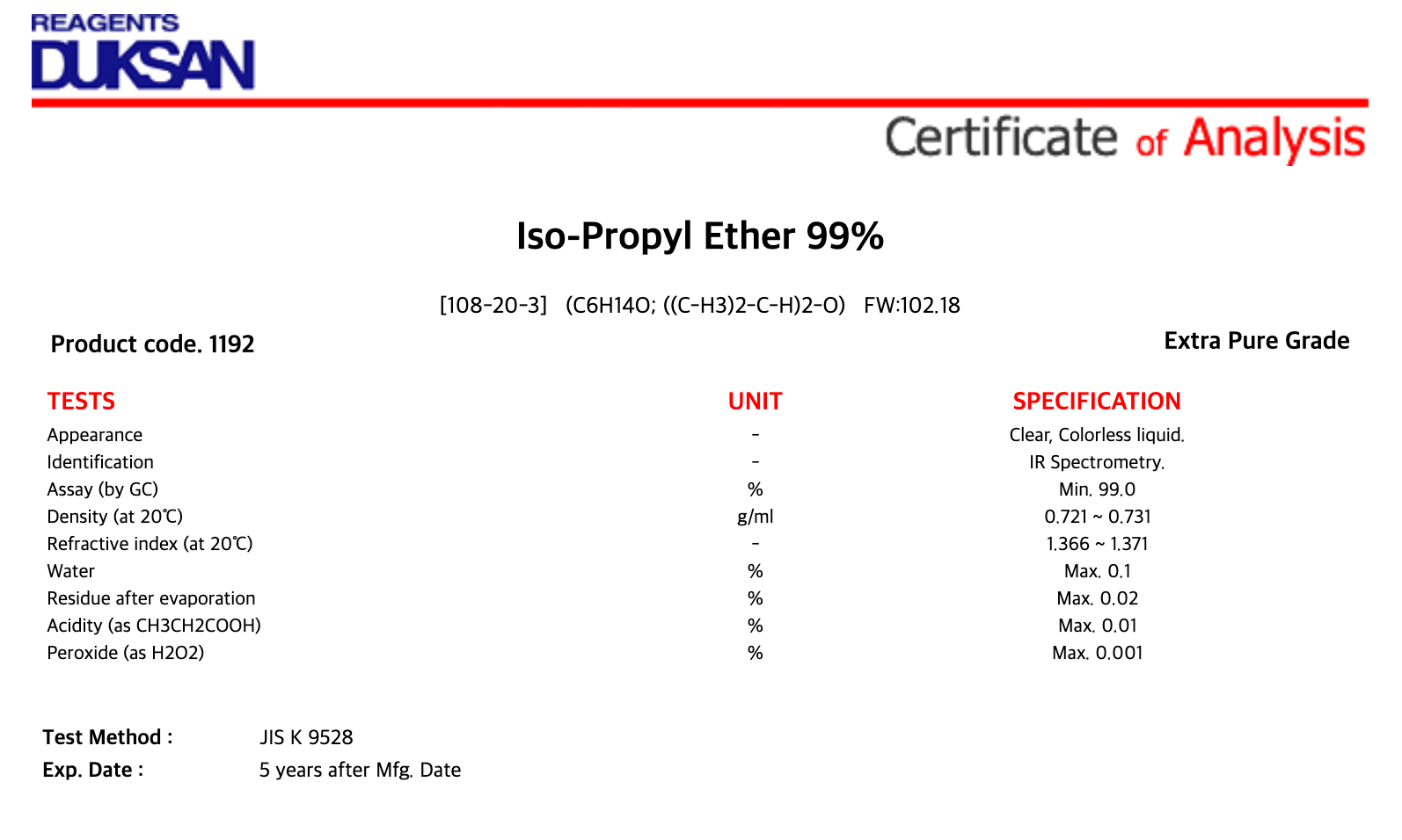 [1192] Iso-Propyl Ether, Extra Pure, 18 ℓ, CAS# 108-20-3 + 151,800원