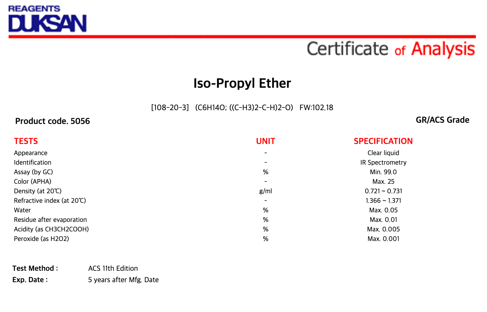 [5056] Iso-Propyl Ether, GR/ACS, 4 ℓ, CAS# 108-20-3 + 37,800원