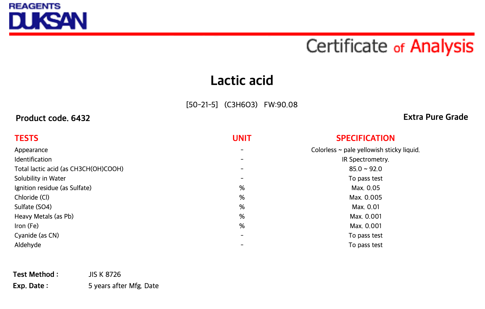[6432] Lactic acid, Extra Pure, 2.5 ℓ, CAS# 50-21-5 + 52,100원