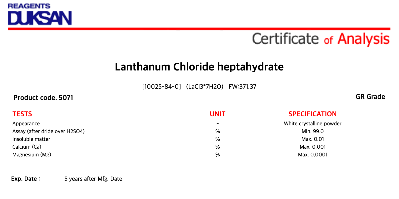 란타넘 트리클로라이드 헵타하이드레이트(란탄 트리클로리드 헵타수화물) (LANTHANUM TRICHLORIDE HEPTAHYDRATE);