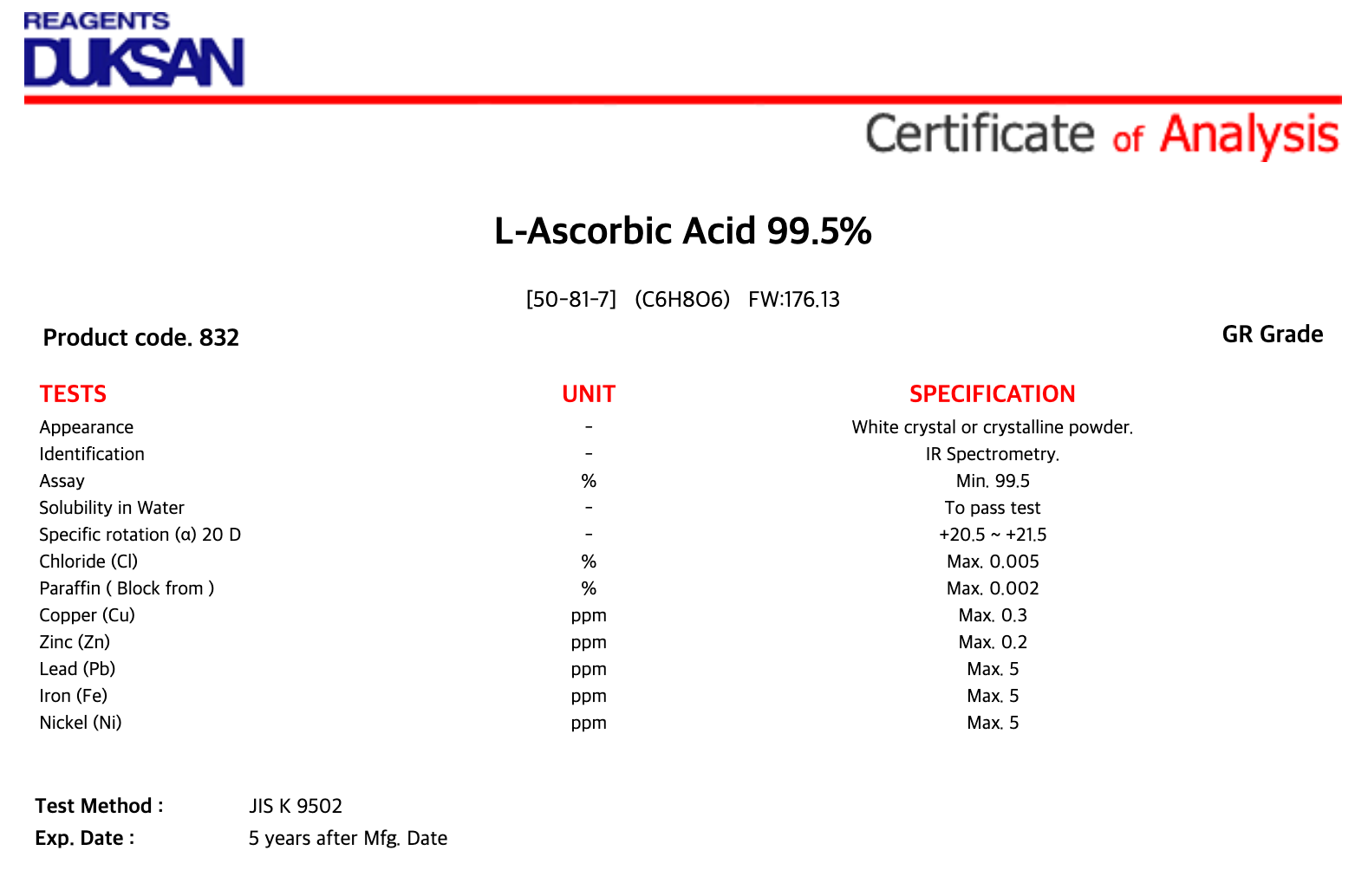 832 1. L-Ascorbic Acid, GR, 500 g, CAS# 50-81-7 1/EA 소비자가 : 30,200원