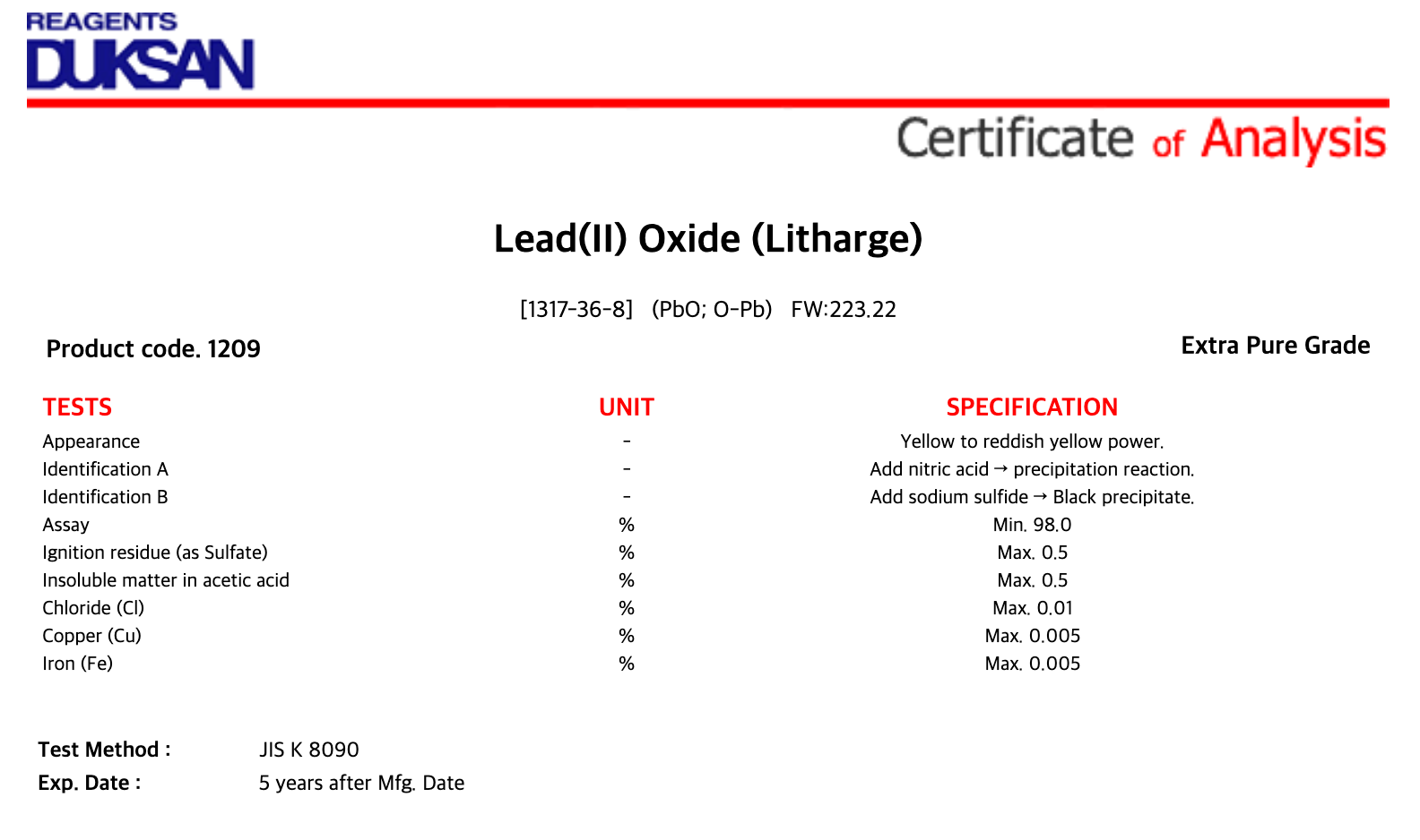 C.I.77577; C.I. 염료 황색 46(C.I. PIGMENT YELLOW 46); 납 모녹시드(LEAD MONOXIDE); 납(II) 산화물(LEAD(II) OXIDE); 납 프록시드(LEAD PROTOXIDE); 플룸보스 산화물(PLUMBOUS OXIDE); 납 산화물 리타르즈(LEAD OXIDE LITHARGE); 마시코트(MASSICOT); 마시코토트(MASSICOTOTE); 황색 납(YELLOW LEAD OCHER); L-68; L-69; L-71; LEAD OXIDE (PBO); LEAD MONOOXIDE; LEAD OXIDE YELLOW; LEAD(2+) OXIDE; PbO