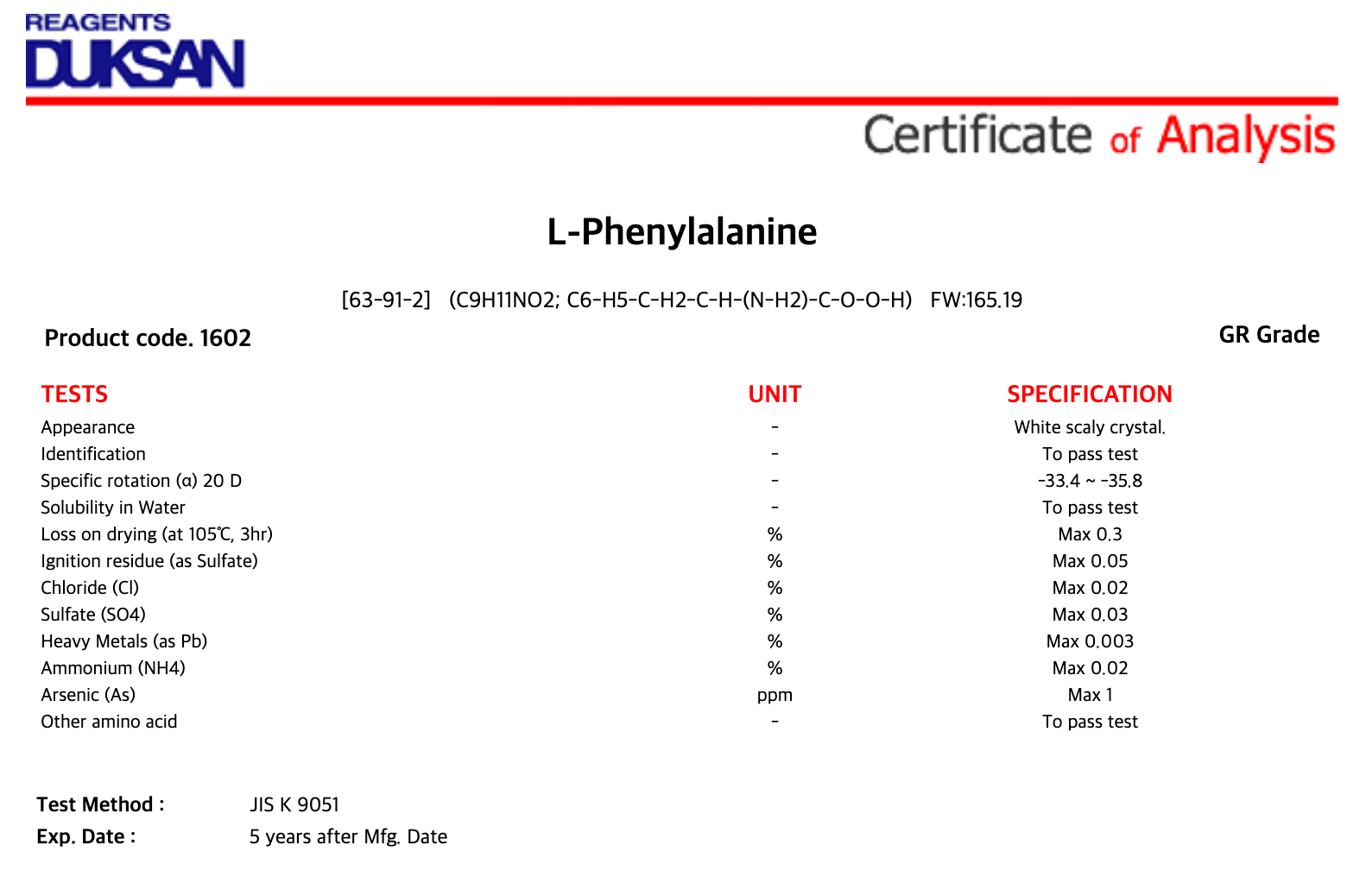 | 품명 : | L-Phenylalanine |