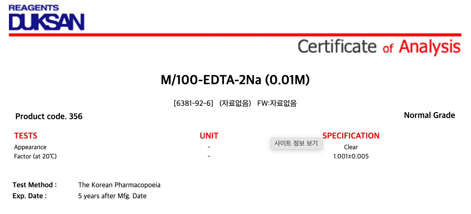 1. M/100-EDTA-2Na (0.01M), Normal, 500 ㎖, CAS# 60-00-4