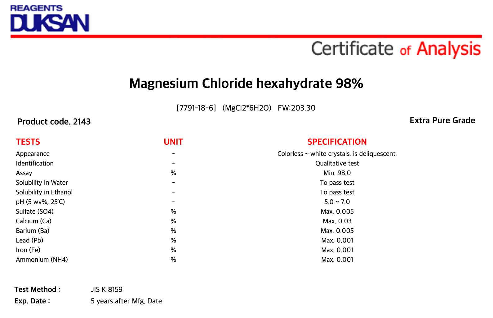 [2143] Magnesium Chloride hexahydrate, Extra Pure, 20 kg, CAS# 7791-18-6 + 187,000원
