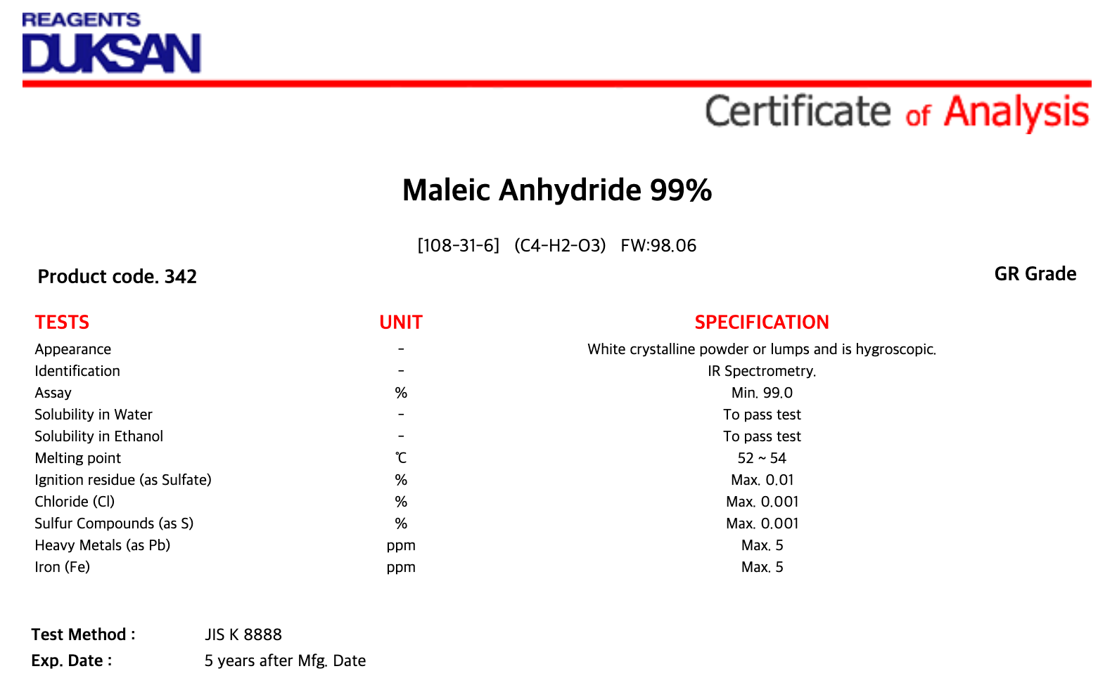 | 품명 : | Maleic Anhydride 99% |