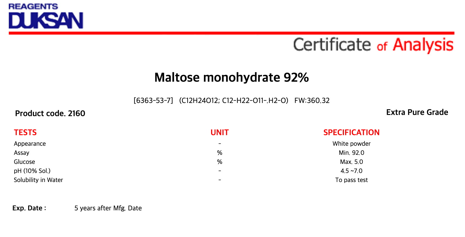 2160 1. Maltose monohydrate, Extra Pure, 25 g, CAS# 6363-53-7 1/EA 소비자가 : 12,700원
