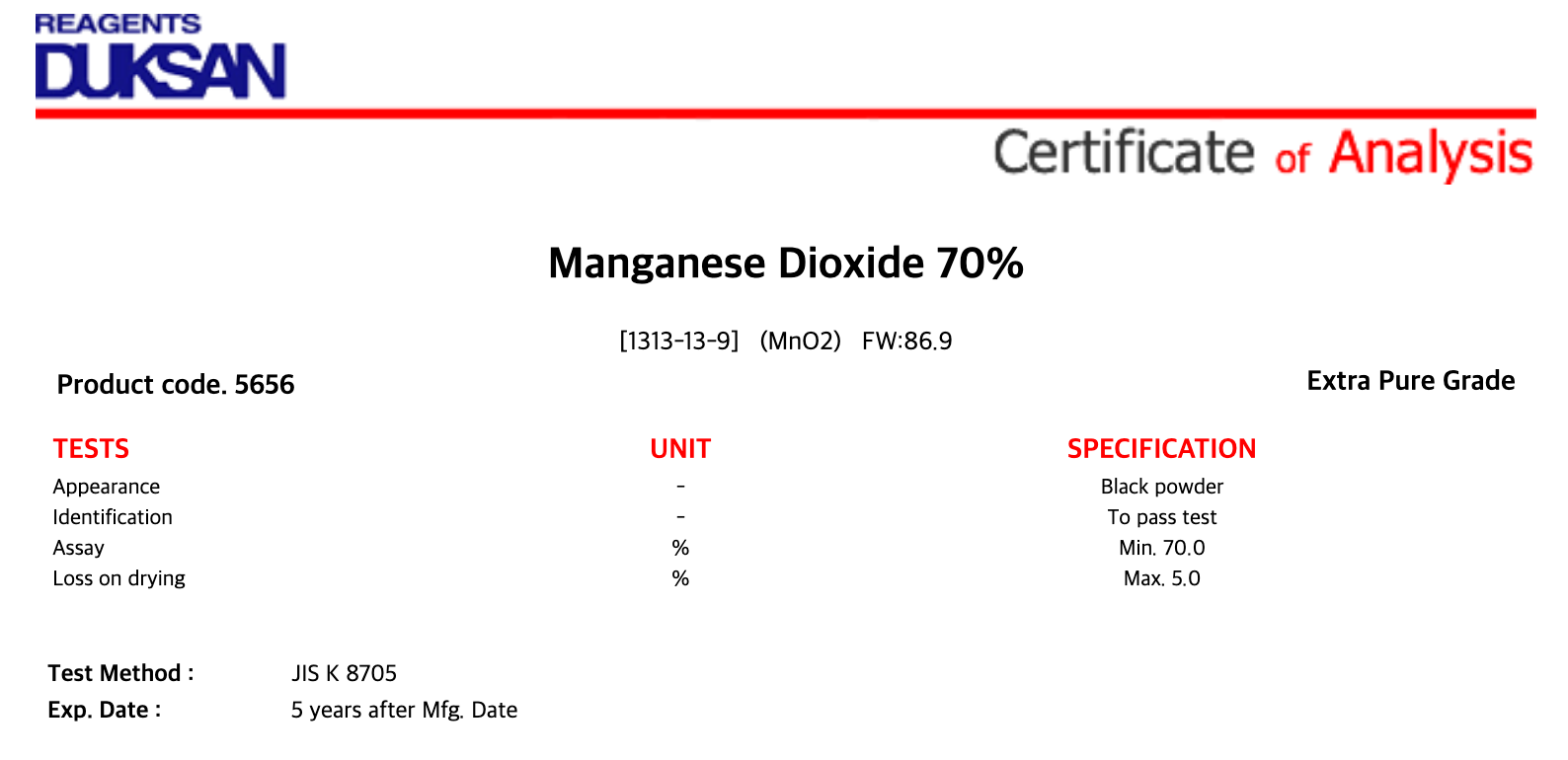 5656 1. Manganese Dioxide, Extra Pure, 1 kg, CAS# 1313-13-9 1/EA 소비자가 : 15,800원