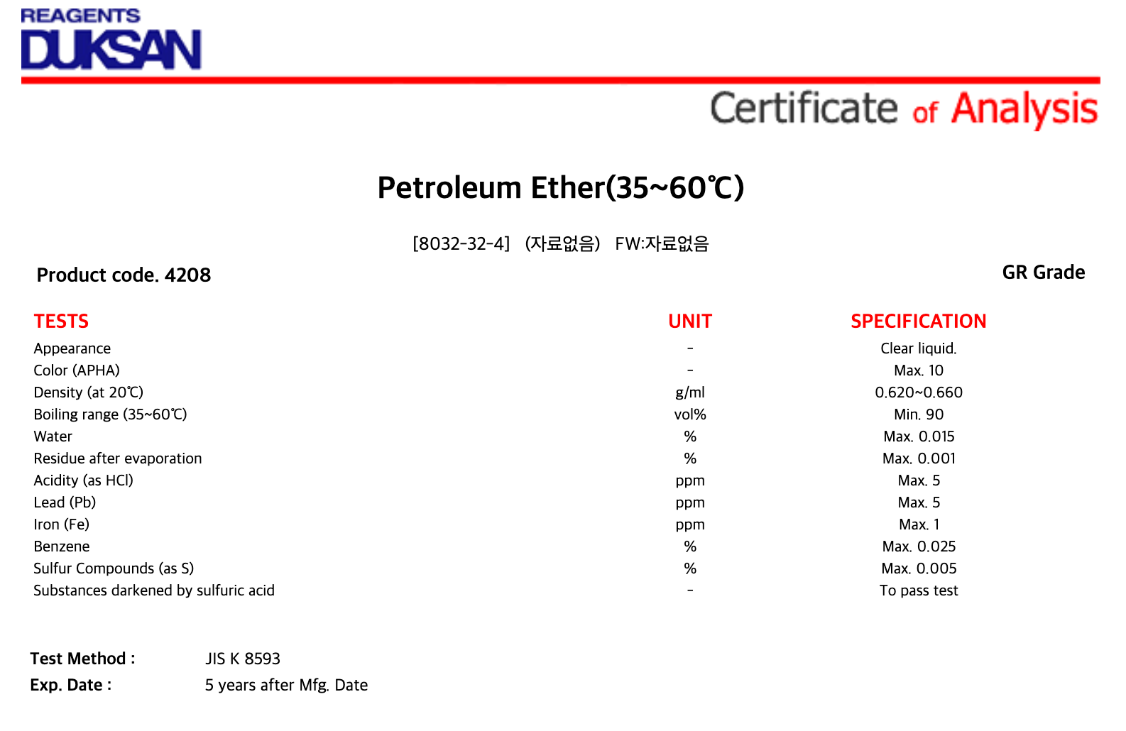 | 초기 끓는점 및 범위 : | 35~60℃ |