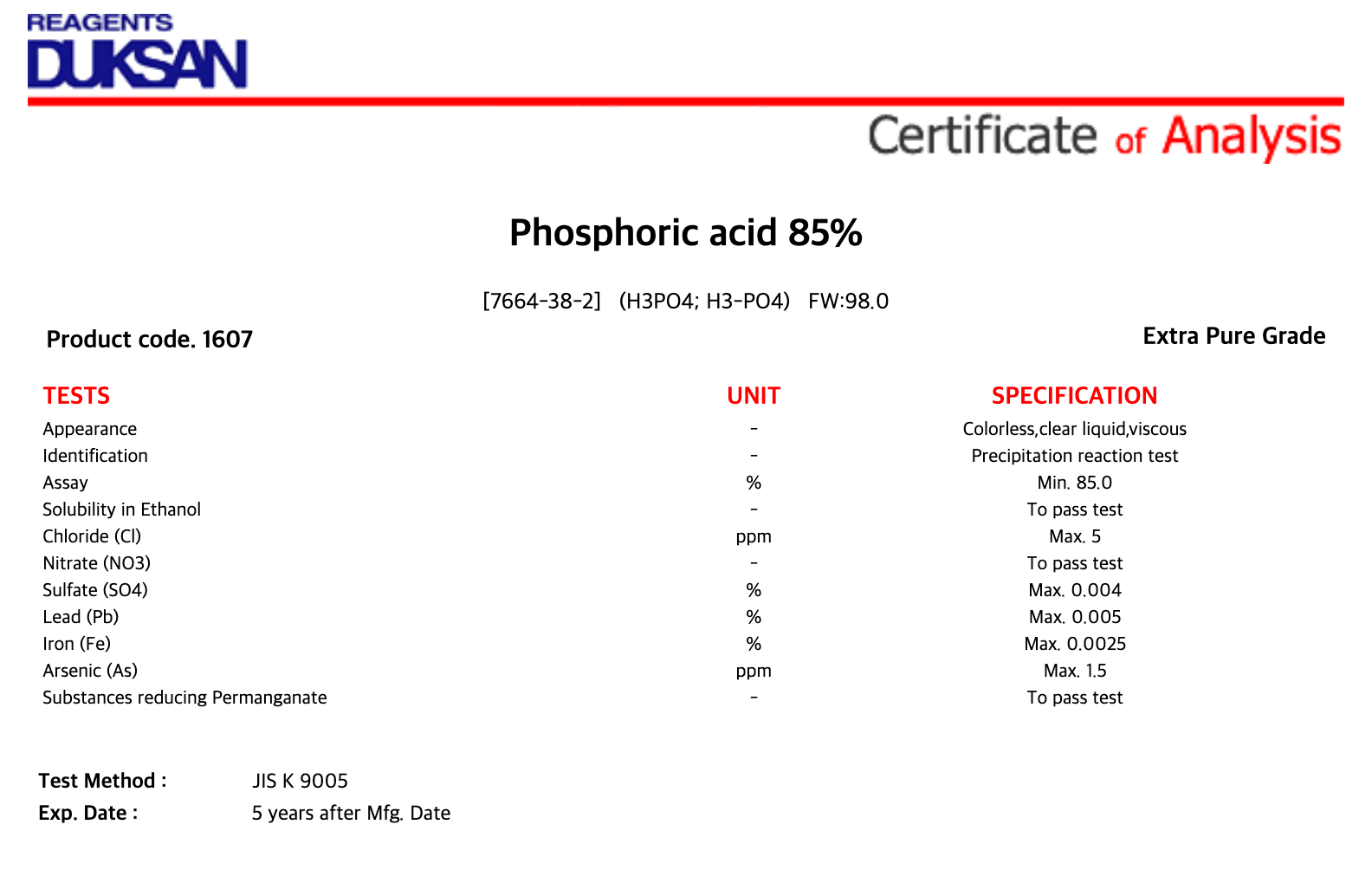 [1607] Phosphoric acid, Extra Pure, 1 kg, CAS# 7664-38-2 + 16,500원