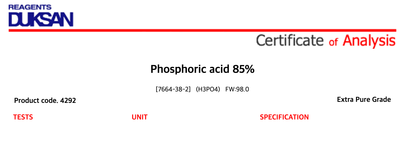 [4292] Phosphoric acid 85 %, Extra Pure, 2.5 ℓ, CAS# 7664-38-2 + 41,200원