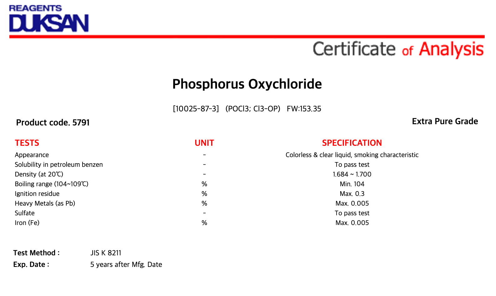 포스포릴 염화물(PHOSPHORYL CHLORIDE);포스포르 염화물(PHOSPHORIC CHLORIDE);포스포르 트리염화물(PHOSPHORIC TRICHLORIDE);포스포르옥시트리염화물(PHOSPHOROXYTRICHLORIDE);인 염화물 산화물(PHOSPHORUS CHLORIDE OXIDE);인 모노산화물 트리염화물(PHOSPHORUS MONOXIDE TRICHLORIDE);인 트리염화물 산화물(PHOSPHORUS TRICHLORIDE OXIDE);포스포릴 트리염화물(PHOSPHORYL TRICHLORIDE);트리클로로포스핀 산화물(TRICHLOROPHOSPHINE OXIDE);트리클로로인 산화물(TRICHLOROPHOSPHORUS OXIDE);인 염화물 산화물 (POCL3)(PHOSPHORUS CHLORIDE OXIDE (POCL3));